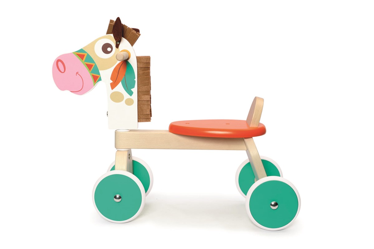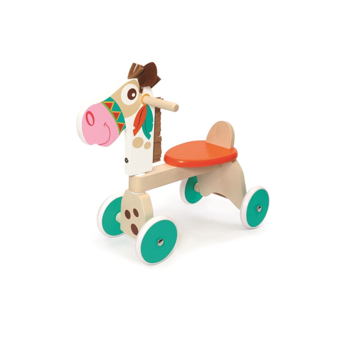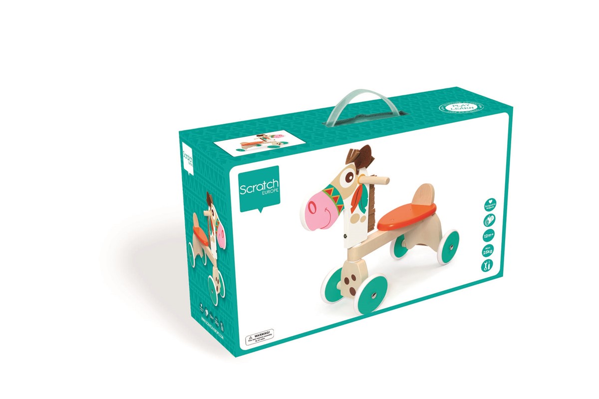 Este andador de cuatro ruedas poni está hecho de madera de alta calidad y tiene neumáticos de goma extremadamente silenciosos que no dejan marcas en el suelo.