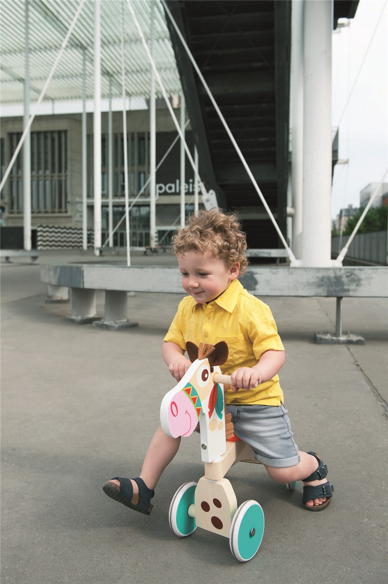 La bicicleta es muy estable y tiene un ángulo de dirección limitado. Los mangos son ergonómicos, por lo que son fáciles de agarrar por las manos pequeñas. El soporte de madera en la parte posterior del sillín asegurará que los niños no se deslicen.