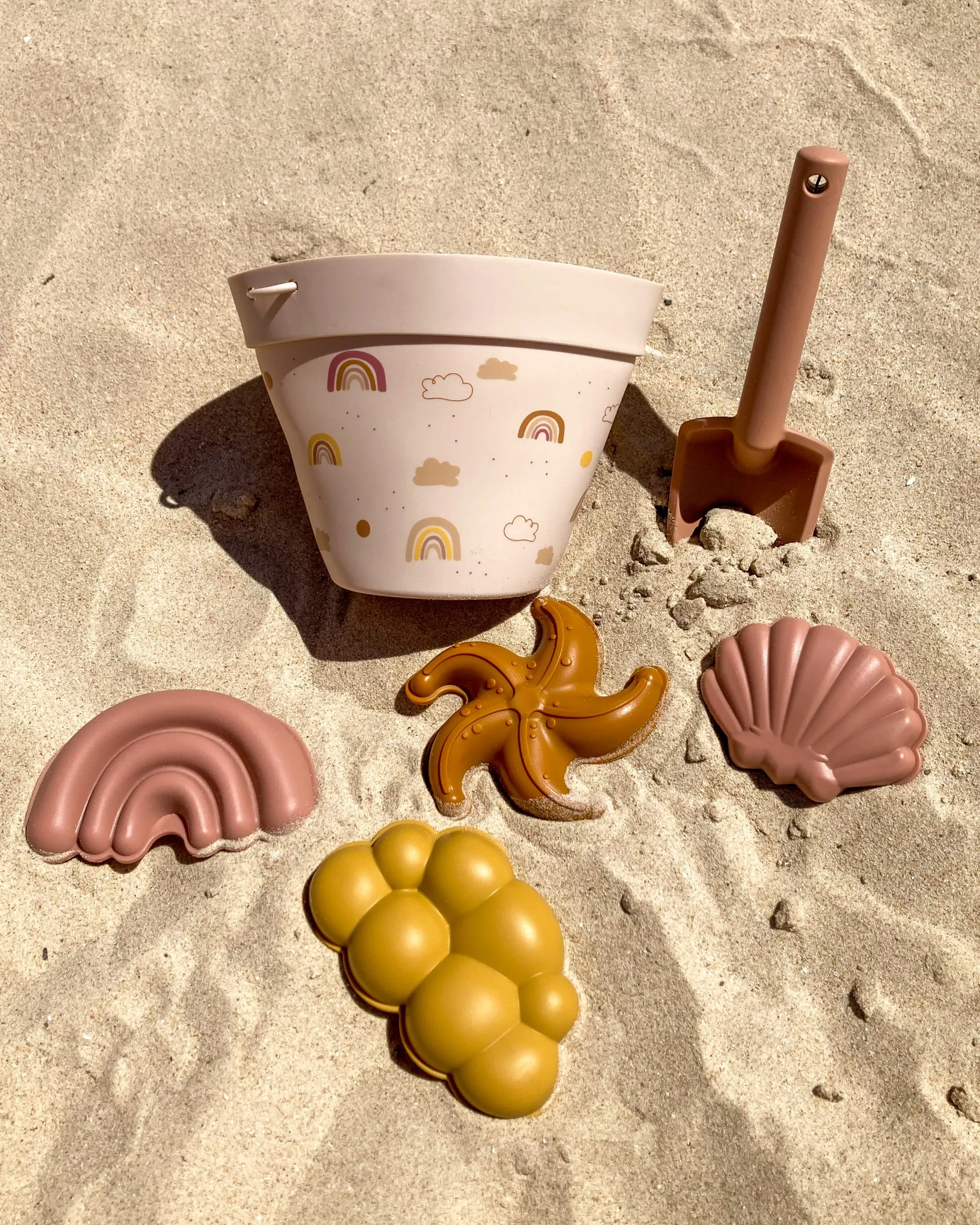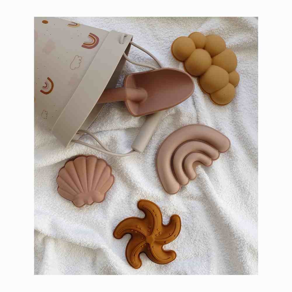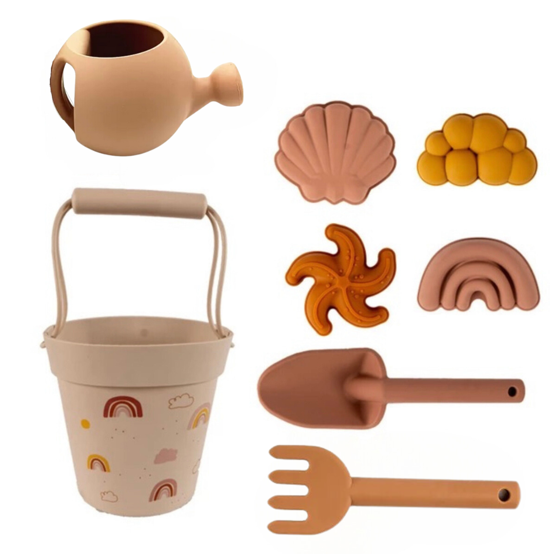 Este set de playa es ideal para llevar con tu pequeño y poder disfrutar muchas horas de juego con la arena. Es duradero y está hecho de silicona 100%. La silicona es suave al tacto y flexible, por lo que es muy fácil de transportar al ocupar muy poco.